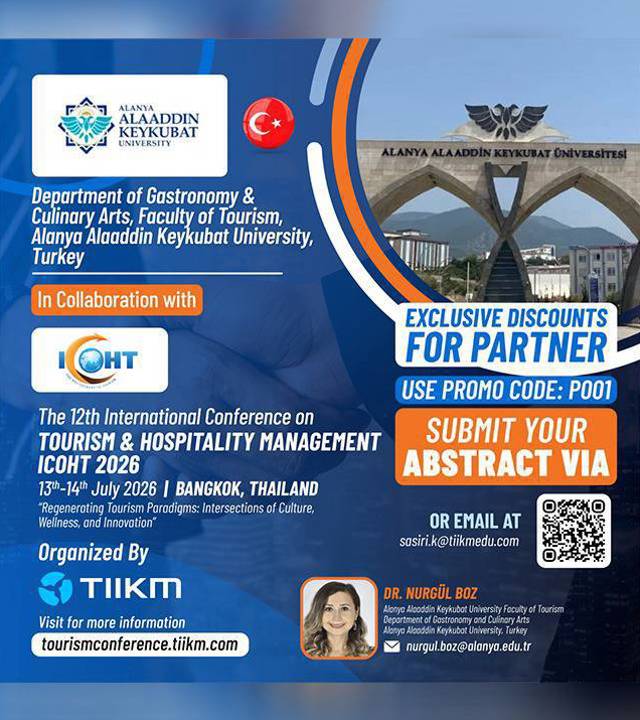Alanya Alaaddin Keykubat Üniversitesi Turizm Fakültesi Gastronomi ve Mutfak Sanatları Bölümü, The International Institute of Knowledge Management (TIIKM) iş birliğiyle düzenlenecek olan 12. International Conference on Hospitality and Tourism Management (ICOHT 2026)’ya akademisyenleri ve öğrencileri bildiri göndermeye davet etmektedir.