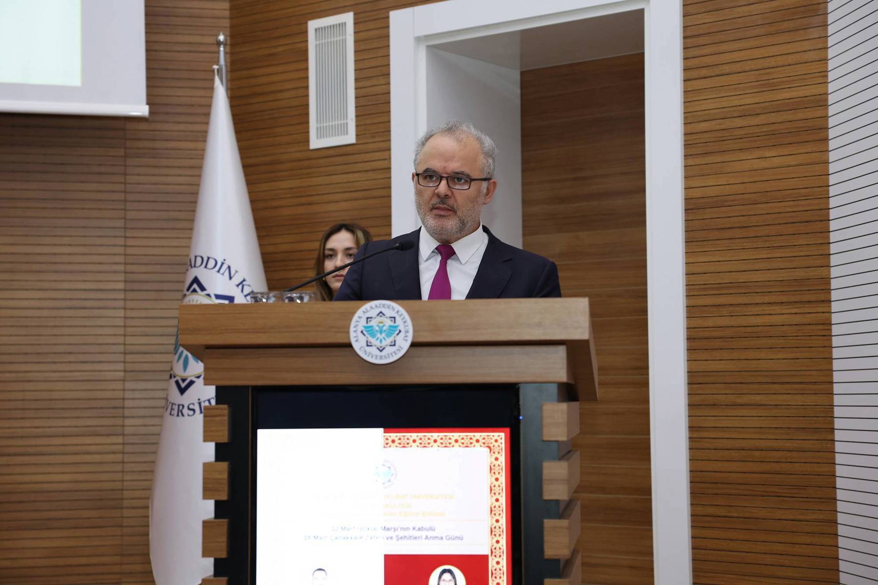 Programın açış konuşmasını yapan Rektör Yardımcısı Prof. Dr. Atıf Bayramoğlu, bu iki tarihi değerin Türk milletinin hafızasında, ruhunda ve vicdanında kenetlendiğini belirterek, “12 Mart İstiklal Marşı’nın kabulü kalemle yazılmış bir diriliş, 18 Mart Çanakkale Zaferi ise kanla yazılmış bir varoluşun adıdır. İstiklâl Marşı, bir milletin “Korkma!” diye başlayan en büyük cesaretidir. Çanakkale ise o cesaretin ete kemiğe bürünmüş hâlidir. Bu iki büyük değer, bize sadece geçmişi anlatmaz; aynı zamanda kim olduğumuzu, nereden geldiğimizi ve nereye yürümemiz gerektiğini hatırlatır. İşte bu yüzden böylesi programlar oldukça önem arz etmektedir. Bunlar, bir milletin kendini yeniden hatırladığı, kökleriyle bağ kurduğu, değerlerini diri tuttuğu anların adıdır.” dedi. Programın moderatörlüğünü üstlenen Doç. Dr. Yavuz Uysal, açılışta yaptığı konuşmada Çanakkale’de cephede verilen mücadelenin İstiklal Marşı’nda kelimelere dönüştüğünü belirterek, “Bu iki mücadele aynı ruhun ve aynı diriliş hareketinin yansımasıdır.” dedi. Akif’in ödülü reddetme hassasiyetine ve marşın bir kimlik inşası olduğuna değinen Bayram, gençlere marşın her dizesinin altındaki derin anlamı sorgulama çağrısında bulundu. Dr. Irmak Karabulut ise Çanakkale Zaferi’nin Mustafa Kemal Atatürk’ü dünya tarihine kazandıran bir deha örneği olduğunu anlattı. Siperler arasındaki mesafenin 8 metreye kadar düştüğü o anlarda Türk askerindeki sarsılmaz tevekkülü vurgulayan Karabulut, Atatürk'ün Anzak annelerine yazdığı mektubu hatırlatarak, “Çanakkale’yi kazandıran bu yüksek ruhtur.” dedi. Programın devamında Dr. Öğr. Üyesi Melih Can ve Dr. Öğr. Üyesi Adem Karaca tarafından müzik dinletisi yapıldı. Program teşekkür belgelerinin verilmesiyle sona erdi.