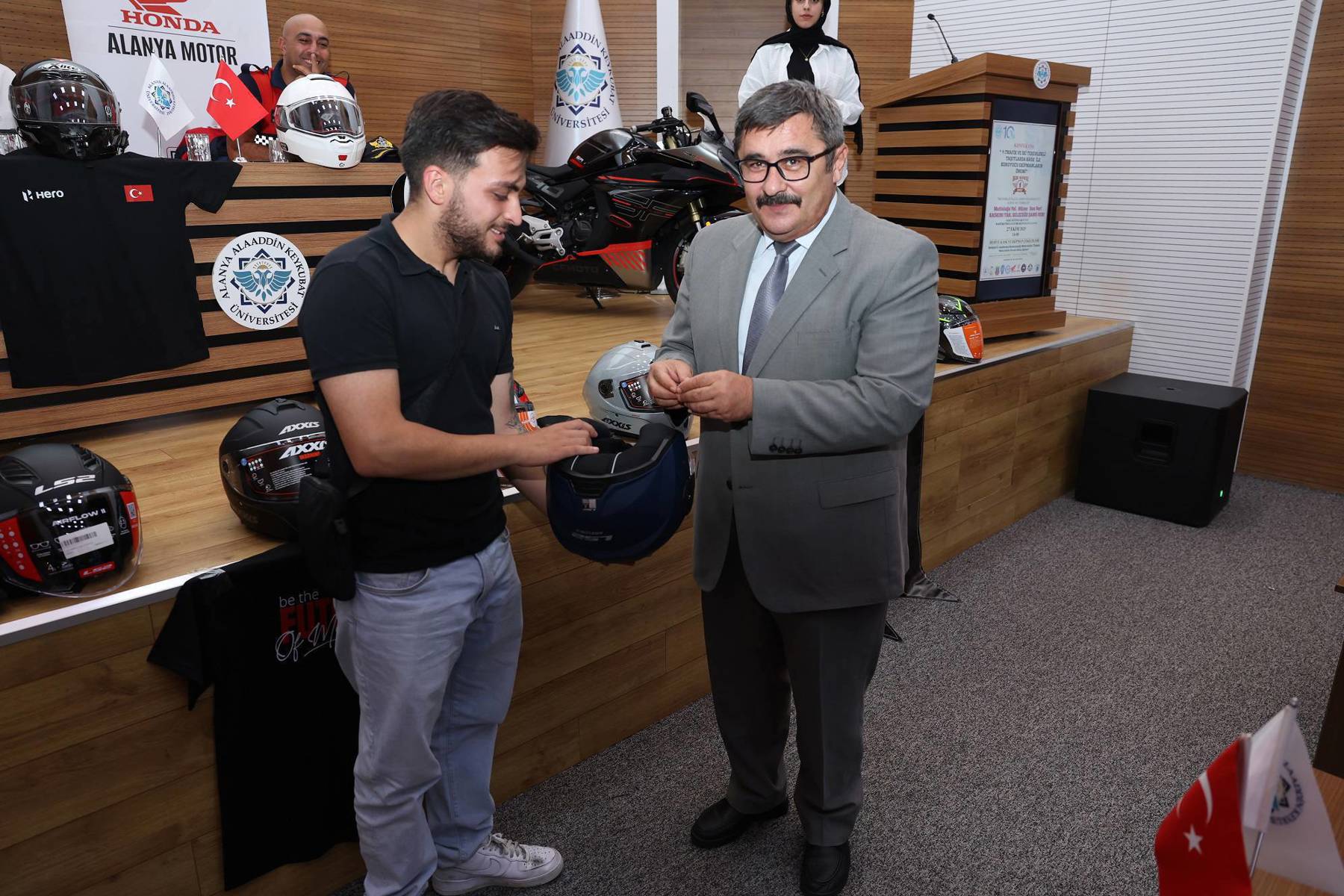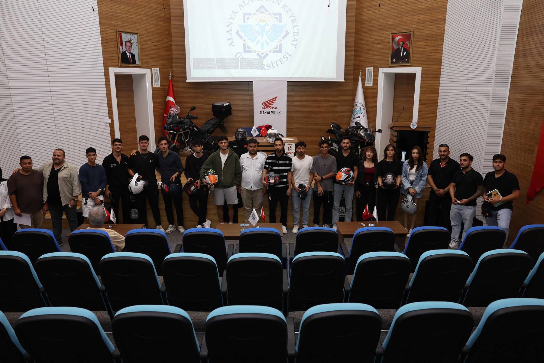 Alanya Alaaddin Keykubat Üniversitesinde (ALKÜ) birçok konuda toplumsal ve bireysel bilinçlenme amacıyla etkinlikler ile projeler birbiri ardına devam ediyor. ALKÜ Motospor Topluluğu Akademik Danışmanı Öğr. Gör. Serdar Aslan koordinatörlüğünde bu yıl dokuzuncusu düzenlenen “Trafik ve İki Tekerlekli Taşıtlarda Kask ile Koruyucu Ekipmanların Önemi” isimli konferans ve motor sürüş teknikleriyle ilgili uygulamalar yapıldı. 27 Ekim Pazartesi günü Eğitim Fakültesi Başöğretmen Atatürk Konferans Salonu’nda yapılan konferansa, ALKÜ Rektör Yardımcısı Prof. Dr. Mehmet Kılıç, ALTSO MYO Müdürü Prof. Dr. Serdar Bulut ile kurumsal sponsorların yetkilileri katıldı.