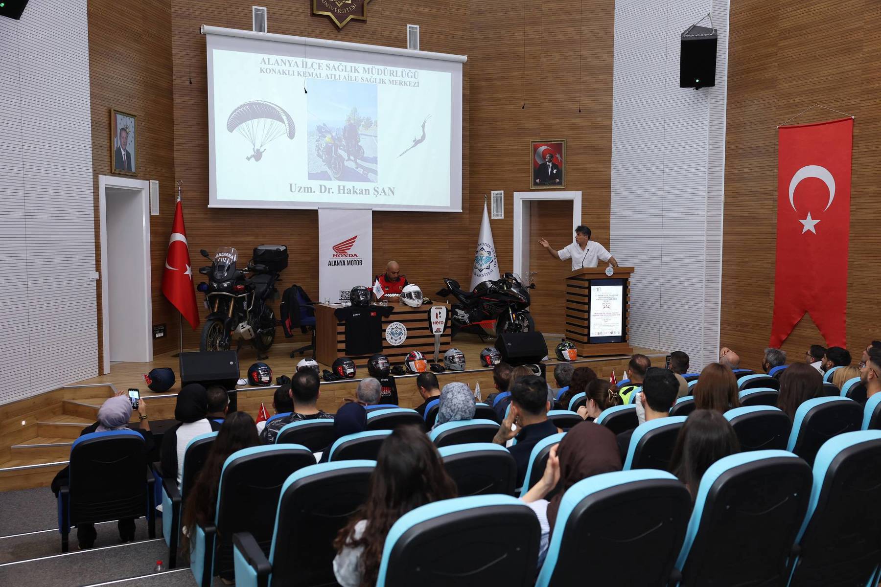 Etkinlikler ilk gün konferansla başladı. Konferans, Alanya Kaymakamlığı, Alanya İlçe Jandarma Komutanlığı, Alanya İlçe Sağlık Müdürlüğü paydaşlar ve ilgili birimlerin katkılarıyla ALKÜ Sağlık, Kültür ve Spor Daire Başkanlığı, ALKÜ Motosiklet Topluluğu organizasyonunda, topluluk akademik danışmanı Öğr. Gör. Serdar Aslan koordinatörlüğünde gerçekleştirildi. Konferansta öğrencilere ve vatandaşlara iki tekerlekli taşıtlar ve trafik kullanımı, trafik akışını paylaşan diğer sürücüler, motosiklet kazalarının önlenmesi ve alınacak tedbirler ile kaza sonrası yapılacak olan tıbbi uygulamalar hakkında kapsamlı bilgiler, konunun uzmanları tarafından vatandaşlara ve öğrencilere anlatıldı. Konferansta, ekipman ve kask çekişleri yapıldı.