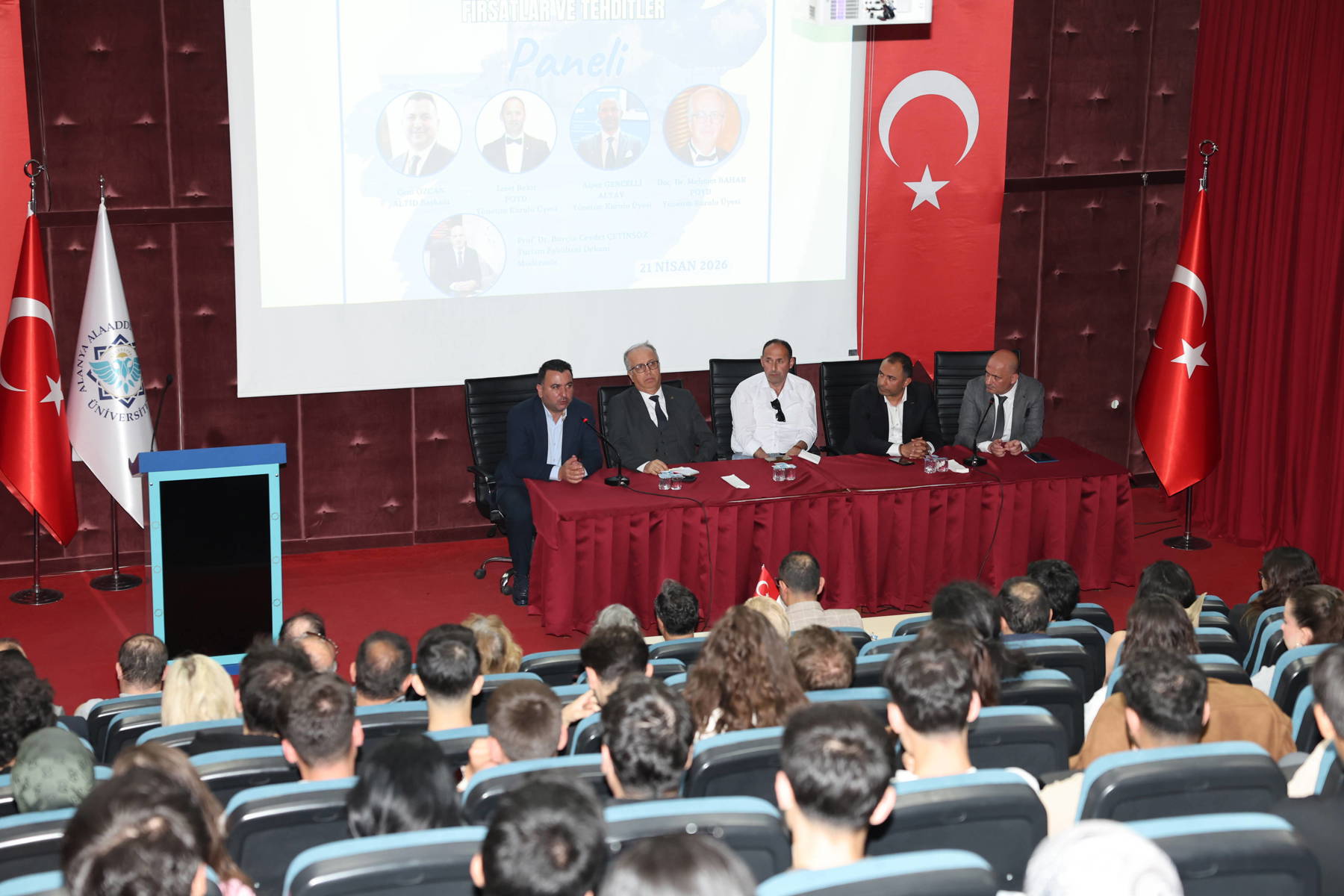 Turizm şehri Alanya’da turizm alanında önemli kuruluşların yöneticileri öğrencilerle buluştu. Turizm Fakültesi Dekanı Prof. Dr. Burçin Cevdet Çetinsöz’ün moderatör olduğu “Ortadoğu Krizinin Alanya Turizmine Etkileri: Fırsatlar ve Tehditler” panelinde ALTİD Başkanı Cem Özcan, POYD Yönetim Kurulu Üyelerinden Doç. Dr. Mehmet Bahar, İzzet Bekir, ALTAV Yönetim Kurulu Üyesi Alper Gencelli öğrencilere deneyimlerini anlattı. Yoğun katılımla yapılan programda sektör hakkında önemli konular ele alındı.