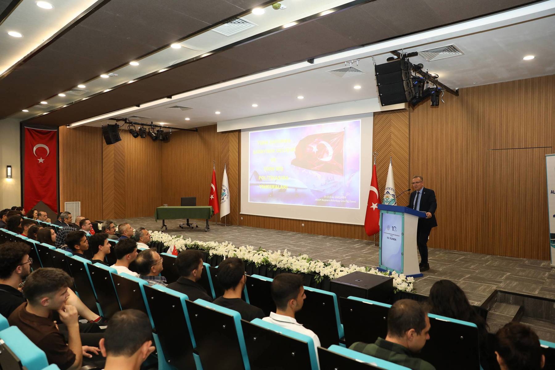 Alanya Alaaddin Keykubat Üniversitesi (ALKÜ) konferans ve seminerler düzenlemeye devam ediyor. ALKÜ ev sahipliğinde, Emekli Jandarma Kurmay Albay Dr. Eray Güçlüer tarafından “Türk Savunma Sanayinin Gelişimi ve Türk Dış Politikasına Etkisi” başlıklı bir konferans gerçekleştirildi. Etkinlik, savunma sanayinin tarihsel dönüşümüne ışık tutarken, Türkiye’nin dış politika vizyonu üzerindeki stratejik etkilerini de ele aldı. ALKÜ Alev Alatlı Konferans Salonu’nda yapılan konferansa ALKÜ Rektörü Prof. Dr. Kenan Ahmet Türkdoğan, Rektör Yardımcıları Prof. Dr. Mehmet Kılıç, Prof. Dr. Oğuz Karahan, Genel Sekreter Hüseyin Er, dekanlar, MYO Müdürleri, akademisyenler ve öğrenciler katıldı.