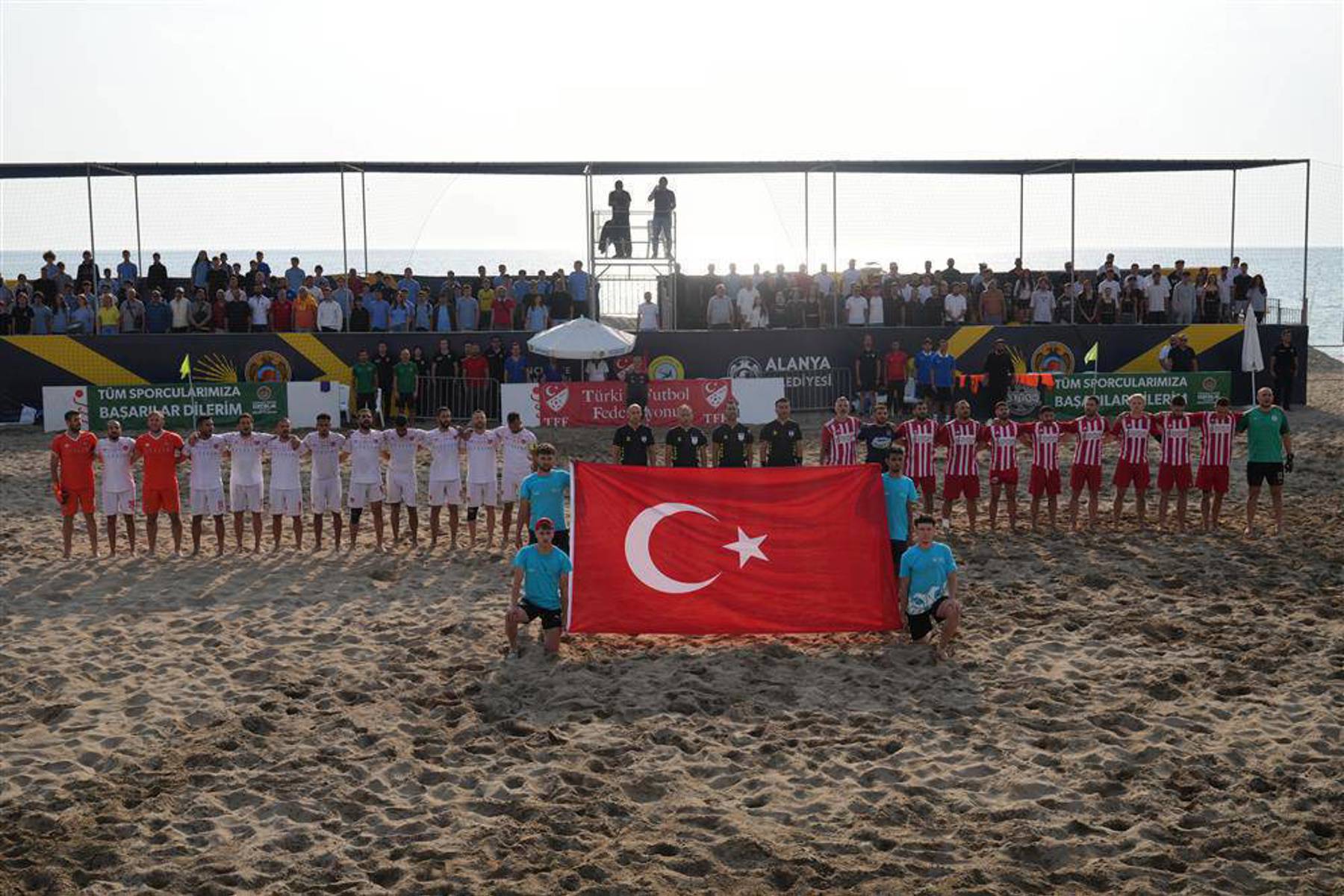 Alanya Uluslararası Plaj Sporları Tesisi’nde gerçekleştirilen TFF Plaj Futbolu Süper Finalleri büyük bir coşkuyla tamamlandı. Türkiye Futbol Federasyonu tarafından Alanya Belediyesi’nin ev sahipliğinde düzenlenen organizasyonun final karşılaşmasını, Alanya Alaaddin Keykubat Üniversitesi (ALKÜ) Rektörü Prof. Dr. Kenan Ahmet Türkdoğan, Rektör Yardımcısı Prof. Dr. Işık Bayraktar, Spor Bilimleri Fakültesi Dekanı Prof. Dr. Hamdi Alper Güngörmüş, Adilcevaz Belediye Başkanı Abdullah Akbaba, Alanya Belediye Başkan Vekili Murat Levent Koçak, Manavgat Belediye Başkan Vekili Mehmet Çiçek, Alanya Belediyesi Başkan Danışmanları Sadık Dizdaroğlu ve Faruk Konukçu, Alanya İlçe Gençlik ve Spor Müdürü Emre Kıldırgıcı ile Plaj Futbolu A Milli Takım Teknik Direktörü Ozan Yılmaz tribünden izledi. Tribünleri tamamen dolduran sporseverler, Alanya ve Manavgat’tan gelen taraftarların coşkulu destekleriyle final atmosferine büyük renk kattı.