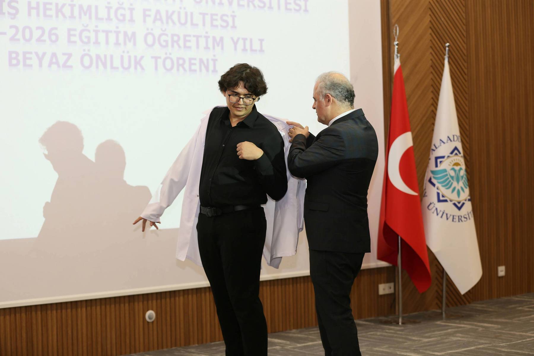 Törende konuşan Rektör Yardımcısı Prof. Dr. Atıf Bayramoğlu, beyaz önlüğün büyük bir sorumluluk, etik değer ve insan sağlığına adanmışlığın sembolü olduğunun altını çizdi. Öğrencilere seslenen Prof. Dr. Bayramoğlu, “Bugün attığınız bu adım; sabır, özveri ve sürekli öğrenmeyi gerektiren uzun bir mesleki yolculuğun başlangıcıdır. Bu mesleğin en değerli yanı, ellerinizle şifa verirken kalbinizle de insanlara umut olmanızdır. Giydiğiniz her beyaz önlük, toplumun sizlere duyduğu güveni ve sizden beklediği özveriyi hatırlatacaktır. Velilerimize, bu anlamlı güne gelirken çocuklarınıza verdiğiniz emek, destek ve güven için ayrıca teşekkür ediyorum. Kıymetli hocalarımıza ise öğrencilerimizin geleceğine ilmek ilmek işledikleri bilgi ve değerler için minnettarız. Sevgili gençler, bugün burada başlayan bu yolculukta bilimin ışığını, vicdanın rehberliğini ve insan sevgisini asla kaybetmemenizi diliyorum. Unutmayın, iyi bir diş hekimi yalnızca el becerisiyle değil, empatisi ve etik duruşuyla da fark yaratır. Hepinizi tebrik ediyor, beyaz önlüklerinizin sizlere başarı, saygınlık ve mesleki gurur getirmesini temenni ediyorum.” dedi.