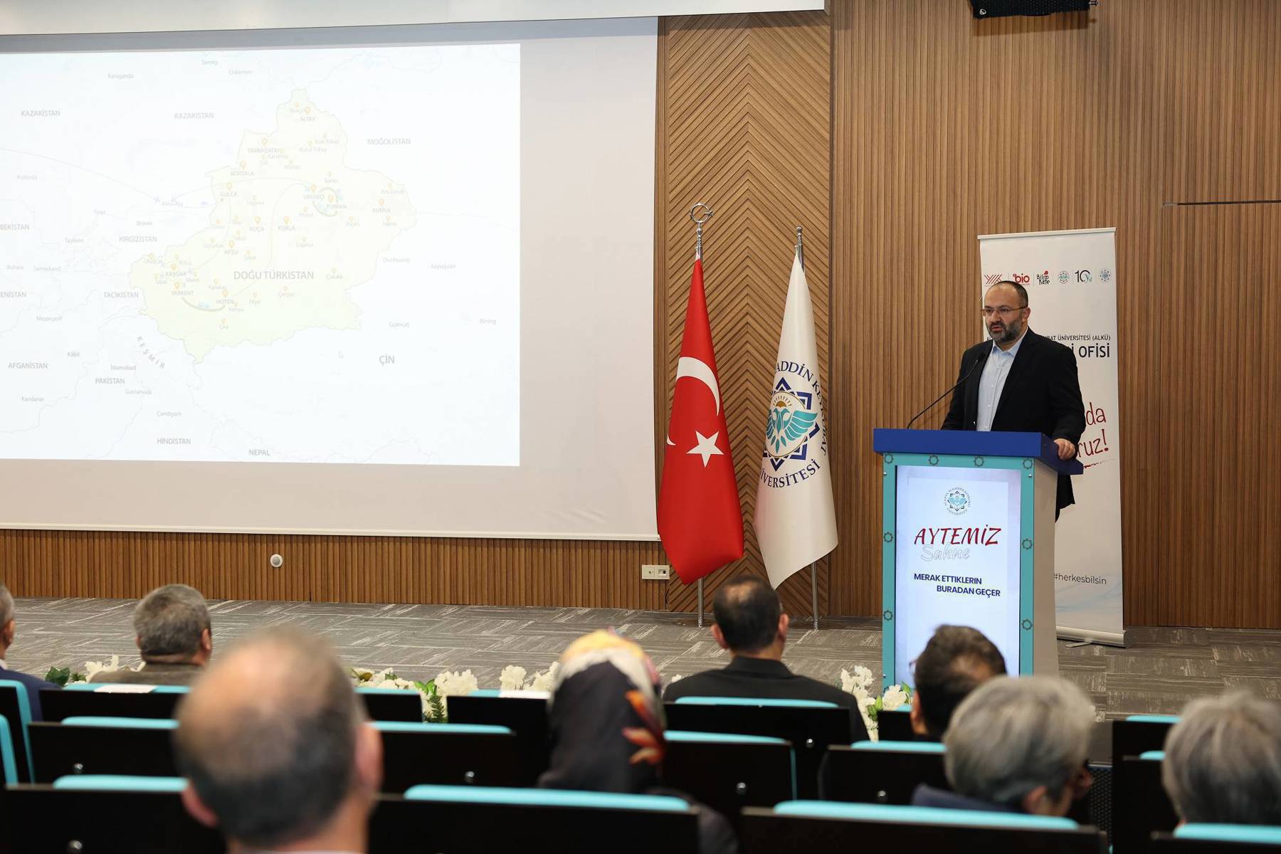 Alanya Alaaddin Keykubat Üniversitesinde yapılan etkinlikler ve programlarda dünyada meydana gelen olaylar detaylarıyla masaya yatırılıyor. Üniversitelerdeki akademik bilginin toplumla paylaşılması için hayata geçirilen ALKÜ Bilim İletişimi Ofisi tarafından Aytemiz’in katkılarıyla düzenlenen “Aytemiz Sahne- Merak Ettiklerin Buradan Geçer” etkinliğinde Gazeteci Yazar Taha Kılınç, Doğu Türkistan’da yaşanan insani dram ve Türk dünyasındaki farkındalık düzeyini ele aldı. Rektörlük Binası Alev Alatlı Konferans Salonu’nda yapılan etkinliğe, Rektör Yardımcıları Prof. Dr. Mehmet Kılıç, Prof. Dr. Atıf Bayramoğlu, Prof. Dr. Işık Bayraktar, Genel Sekreter Hüseyin Er, dekanlar, MYO müdürleri, akademisyenler, öğrenciler ve vatandaşlar katıldı.