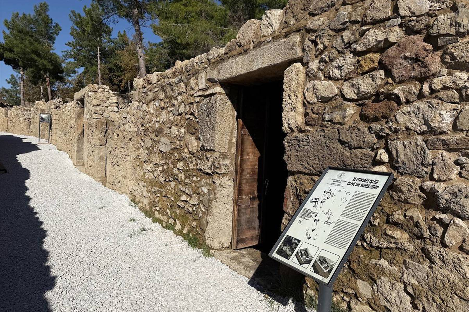 Ergürer, kentte neredeyse her yapının altında bir zeytinyağı ya da diğer üretimlere ait atölye ve işliklerin olduğuna dikkati çekerek, bunların üzerinde de 2 veya 3 katlı konutların bulunduğunu kaydetti. Evlerin caddeye bakan taraflarında üretime yönelik dükkan, üst katlarda ise insanların yaşadığı konutların olduğunu anlatan Ergürer, "Zeytinyağı işliklerinin kent içinde olması bizim için ilginç oldu. Genelde üretimler kentin dışında, sur dışındaki alanlarda olur. Burada ise neredeyse her yapının altında olması dikkat çekici. Bu durum, burada zeytinyağı üretiminin yoğun bir şekilde yapıldığını gösteriyor." diye konuştu. Kültür ve Turizm Bakanlığı, Kültür Varlıkları ve Müzeler Genel Müdürlüğünün izni ve desteğiyle Geleceğe Miras Projesi kapsamında çalışmalar yürüttüklerini dile getiren Ergürer, 2024'te kentin güneybatı caddesinde neredeyse tüm taş ve malzemelerin orijinal yerinde olduğu bir zeytinyağı işliğini tespit ettiklerini kaydetti. Ergürer, zeytinyağının biriktirildiği, o dönemde "pitos" olarak adlandırılan büyük depolama kabının da yine orijinal yerinde bulunduğunu aktararak, şöyle devam etti: "Bakanlığımıza bu bulguların belgelerini ve verilerini paylaştıktan sonra, burayı yeniden ayağa kaldırarak, gelen ziyaretçilere zeytinyağı üretimini göstermek amacıyla çalışma yaptık. Burada zeytinler işliklerde kırılıyor, pres bölümüne götürülüyor, ahşap kollar ve mekanizmalar yardımıyla zeytinyağı sıkılarak kaplara biriktiriliyor. Daha sonra çeşitli aletlerle diğer depolama kaplarına aktarılıyor."